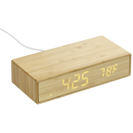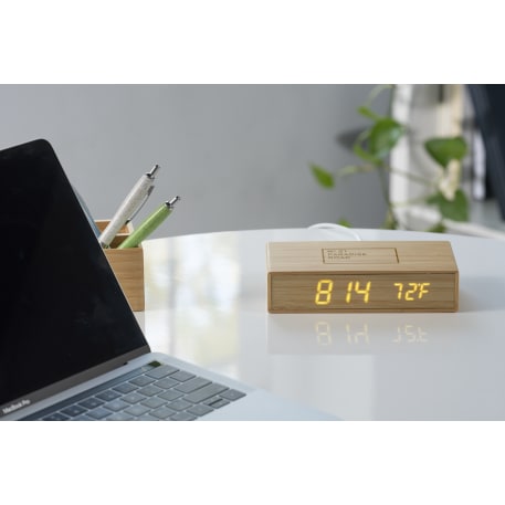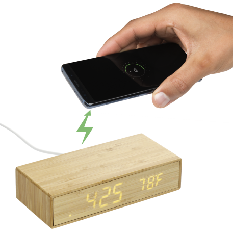 The Bamboo Wireless Charging Desk Clock can be used on any desk, end table or night stand. The top surface has a 5W wireless charging pad for compatible devices. The clock has an alarm function, can show temperature in either Fahrenheit or Celsius and display three different levels of light brightness. One additional USB output 5V/1.5A for charging through a cable. If you want to charge an iPhone series before iPhone 8 with wireless technology, an external wireless charging receiver or receiver case is required. It works with most plastic phone cases on. Includes 39" USB to Type C charging cable. Packaged in a FSC certified premium gift box. Due to the nature of the bamboo material, variations in laser imprinting quality may occur. Through a partnership with 1% For The Planet, one percent of sales of all EcoSmart® products are donated to environmental nonprofits.