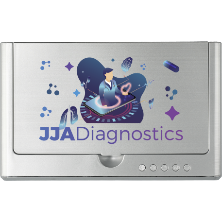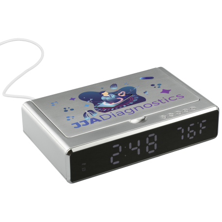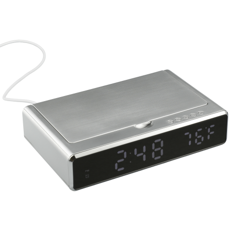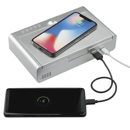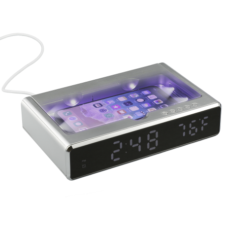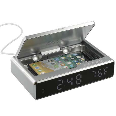 The UV Sanitizer Desk Clock with Wireless Charging can be used on any desk, end table or night stand. It uses UV-C light technology without chemicals or mercury for sanitation to kill 99% of microorganisms tested. Two UV-C LEDs work at 270-285nm wavelength coverage. It can sanitize almost anything that fits inside (6.75" L * 3.25" W * 0.5" H), such as large phones (iPhone 12 Pro Max), etc.. Also acts as a clock with an alarm while using the top to charge your wireless charging enabled smartphone(5W). There is one USB-A output of 5V/2A to support charging via desired cable. The clock can show temperature in either Fahrenheit or Celsius and display three different brightness of light. It works with most plastic phone cases on. Please peel off the protecting film on the clock screen before use. Included 3.28 feet USB to Type C charging Cable. Packed in premium gift box. Available for shipment within the United States (including Alaska Hawaii & Puerto Rico). Not available for export.