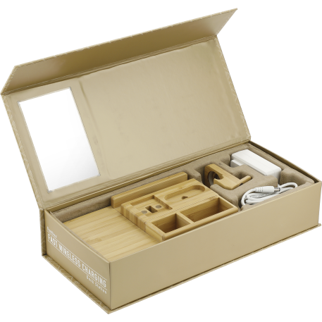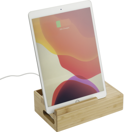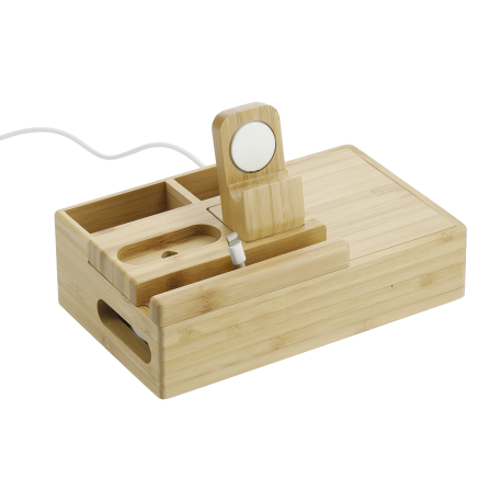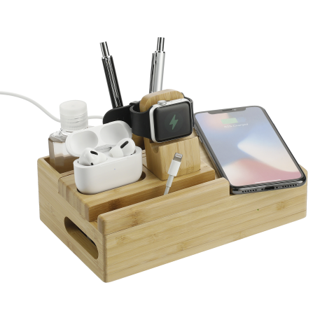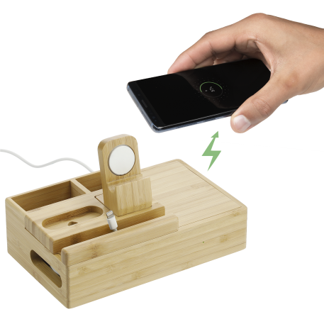 The Bamboo Fast Wireless Charging Dock Station features a fast wireless charging surface (5W/7.5W/10W), smart watch charger stand, true wireless earbuds charging slot, phone/tablet stand, and two organizational compartments all in one piece. Three outputs: 5V/2.4A max. If you want to charge an iPhone series before iPhone 8 with wireless technology, an external wireless charging receiver or receiver case is required. It works with most plastic phone cases on. Includes a UL listed AC adapter (59" long). Packaged in a FSC certified premium gift box. Due to the nature of the bamboo material, variations in laser imprinting quality may occur. Through a partnership with 1% For The Planet, one percent of sales of all EcoSmart® products are donated to environmental nonprofits.