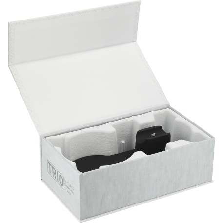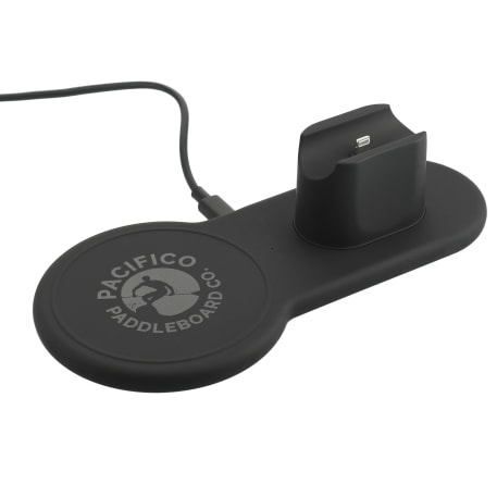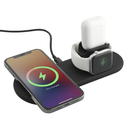 The Trio Wireless Charging Stand can charge your iPhone, iWatch and AirPods all at once. The wireless charging surface supports three different wireless charging modes, 7.5W for All iPhone 8/X/11/12/13 Series, 10W for Samsung Galaxy S9/S9 Plus/S8/S8 Plus/Note 8/9 and more, and 5W standard charging for all enable devices. Features a MFi-certified iWatch Charging Mount for your iWatch and MFi-certified Lightning tip for Airpods. It is recommended to use a power adapter over 10W (not included). Includes a 39-inch USB-A-to-Type-C charging cable. Packaged in a premium gift box.