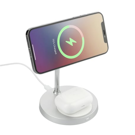The MagClick™ Dual Fast Wireless Charging Stand with Base can hold iPhone 12/13 models magnetically for fast wireless charging, and it's adjustable, letting you tilt your phone to the perfect angle. Supports three different wireless charging modes: 7.5W for iPhone X/8/8 Plus/XS/XS Max/XR/11/11 Pro/11 Pro Max/12/12 Pro/12 Pro Max/12 Mini/13/13 Pro/13 Pro Max/13 Mini; 10W for Samsung Galaxy S9/S9 Plus/S8/S8 Plus/Note 8/9 and more, and 5W standard charging for all enabled devices. The bottom base supports 5W wireless charging for Airpods or other enabled devices. The included metal ring can stick to the backs of phones without magnetic features, allowing them to be held on the top surface for wireless charging. Includes a 39-inch USB-A-to-Type-C charging cable. For fast charging, it's recommended to use quick charge power adapter. Packaged in an FSC-certified premium gift box.