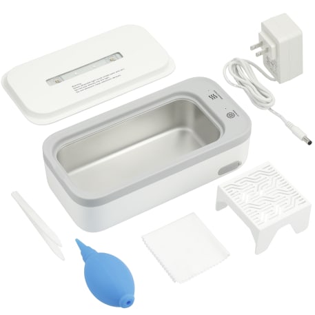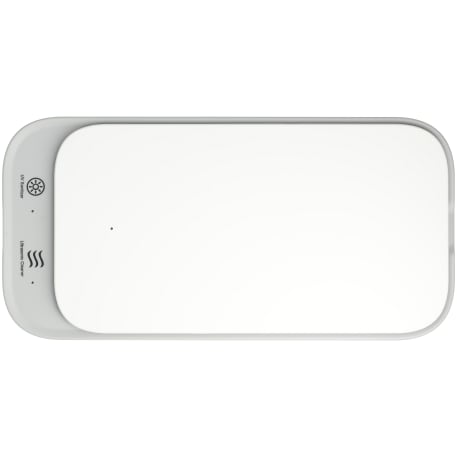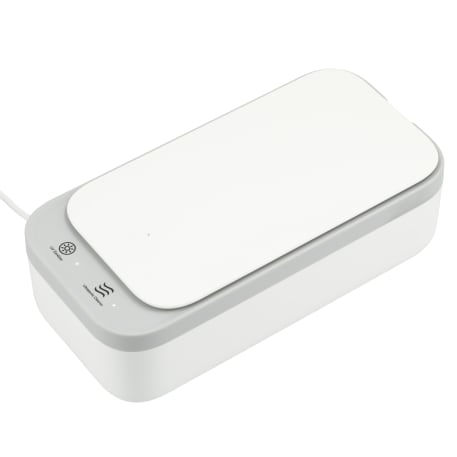 The Ultrasonic Cleaner with Wireless Charging UV Sanitizer features 10W wireless charging, a five-minute UV sanitizer and a three-minute ultrasonic cleaner function. It uses UV-C light technology without chemicals or mercury for sanitation to kill 99% of microorganisms tested. Two UV-C LEDs work at 270-285nm wavelength coverage. It can sanitize almost anything that fits inside (6.875" L * 3.125" W * 1.625" H), such as large phones (iPhone 12 Pro Max), keys and more. The tank can be filled with water (500 ml maximum), letting you clean sunglasses or other accessories using the ultrasonic cleaning function. It includes an accessory stand, tweezers, cleaning cloth (5.5” L * 5.31” W) and a mini air blower. It also includes a 4.91ft UL-listed AC adapter with integrated cable. Packed in an FSC-certified premium gift box. Available for shipment within the United States (including Alaska Hawaii & Puerto Rico). Not available for export.