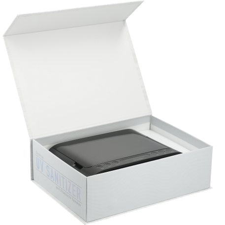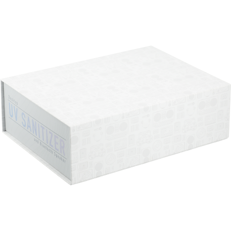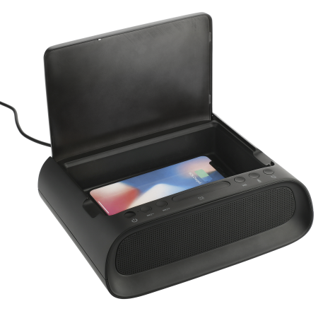 The Desktop UV Sanitizer & Bluetooth Speaker combines premium sound, 3 UVC lights, music controls, & a microphone. Simply open the top lid & place your mobile phone, jewelry, or mask to begin the cleaning process. The speaker features a 3-minute quick clean & a 5 minute thorough clean. The 3-watt Bluetooth speaker produces premium sound that can be heard around the office! The full music controls allow you to activate your voice assistance, change the audio, control the volume, & accept/reject calls. The built-in microphone allows you to use the speaker for your conference calls. Included with the speaker is 31” Type C cable to provide power to the speaker. With a built in USB output the speaker can be used to your charge any electronic device. The speaker must be plugged in to a power source to power on, it doesn’t have a built-in battery. Fits phones up to 6.5" x 4.25". Available for shipment within the United States (including Alaska Hawaii & Puerto Rico). Not available for export.