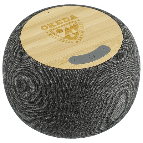 The Garm Fabric & Bamboo Speaker with Wireless Charging is perfect for the desk or countertop. The on-trend mixed material appearance of the bamboo and fabric wrap will get anyone’s attention. The 3-Watt output of the speaker produces crystal-clear sound. Plus, the top part of the speaker is a 5-Watt wireless charging pad that's capable of charging any compatible device. For wireless charging, this piece must be plugged in. The built-in 1200 mAh battery will keep the music playing for over 6 hours. Built-in music controls and microphone for hands-free operation. Bluetooth® version 5.1. A USB-A-to-Type-C charging Cable is included. The top of the speaker is made from FSC®-certified bamboo. The appearance of each piece may appear different because of the natural bamboo.