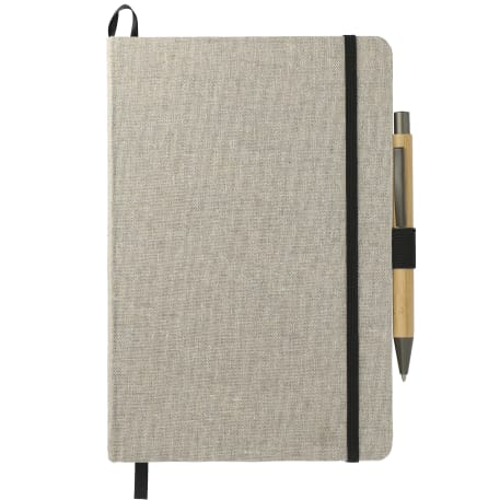 The 5.5" x 8.5" Recycled Cotton Bound JournalBook® Set includes (2800-94) 5.5" x 8.5" Recycled Cotton Bound JournalBook® and (1066-49) Bamboo Quick-Dry Gel Ballpoint. The 5.5" x 8.5" Recycled Cotton Bound JournalBook® is the perfect journal for all of your notetaking needs. Features a recycled cotton, hard cover. Natural color elastic closure, pen loop and ribbon page marker. 80 sheets of FSC® Mix cream lined paper. Back document pocket. FSC label printed inside. Through a partnership with 1% For The Planet, one percent of sales of this and all EcoSmart® products are donated to environmental nonprofits.