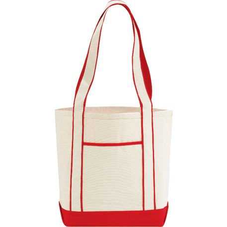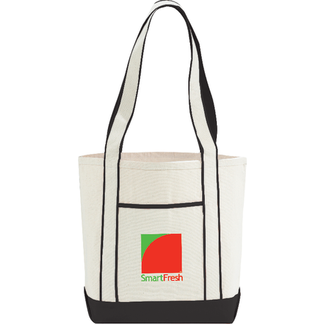 Classic boat tote shape great for outdoor events. Open main compartment. Front pocket. Unique contrast handle treatment. 13" handle drop height.