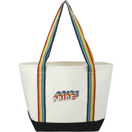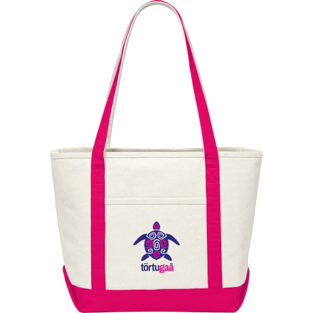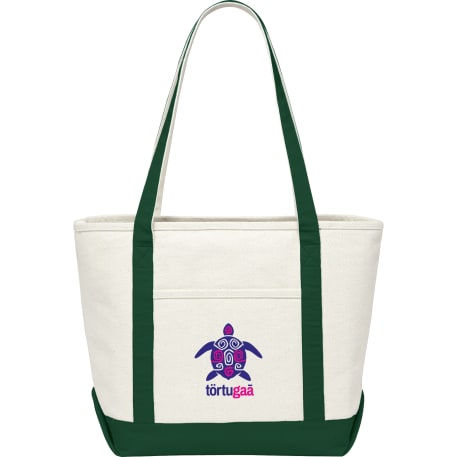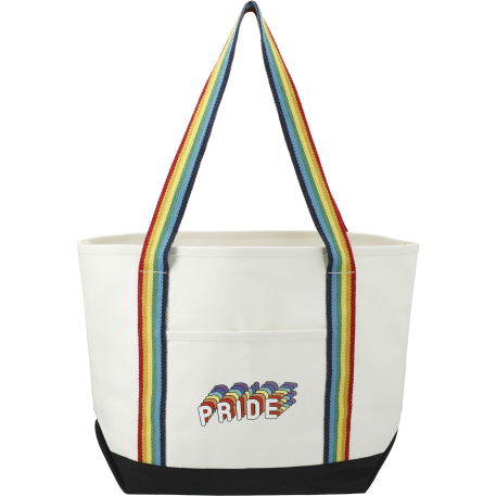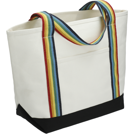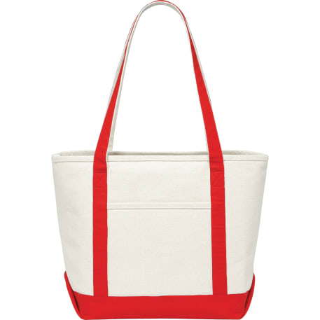Great for outdoor events and travel. Classic boat tote shape in heavy weight and sturdy material. Open main compartment. Open front pocket. 12" handle drop height. Disclaimer: There may be minor variations in shade of the main material due to the nature of the fabric.