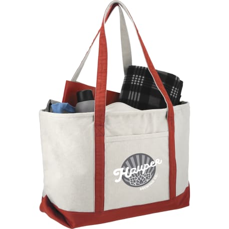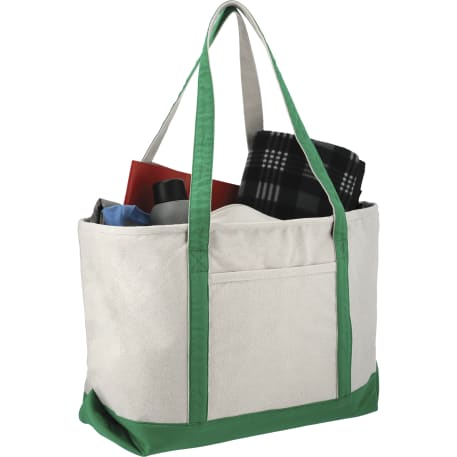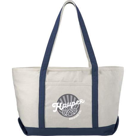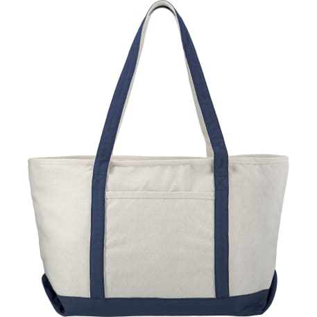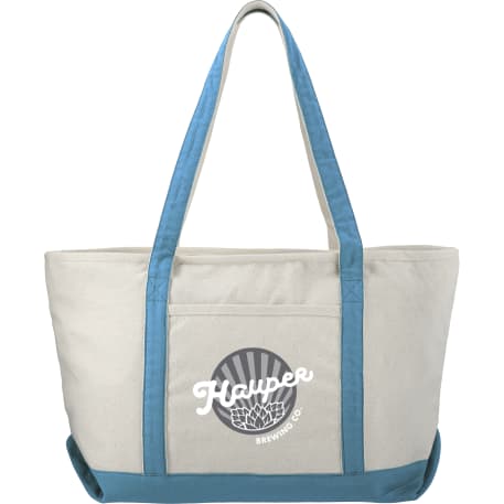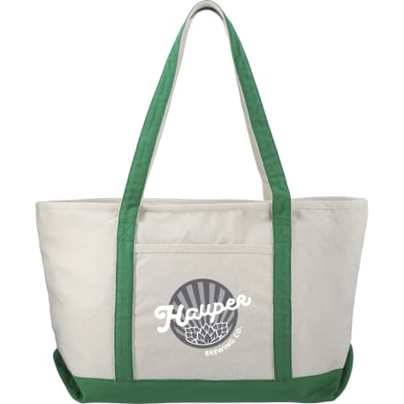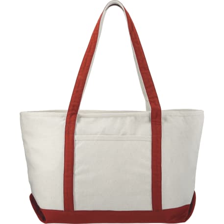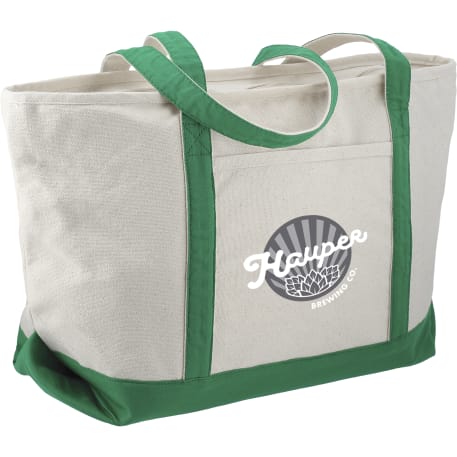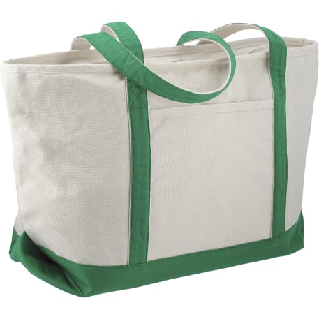 Great for outdoor events and travel. Classic wide boat tote shape in heavy weight and sturdy material. Zippered main compartment. Open front pocket. 12" handle drop height. Disclaimer: There may be minor variations in color of the actual product due to the nature of the fabric dyes, weaves and printing.