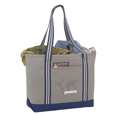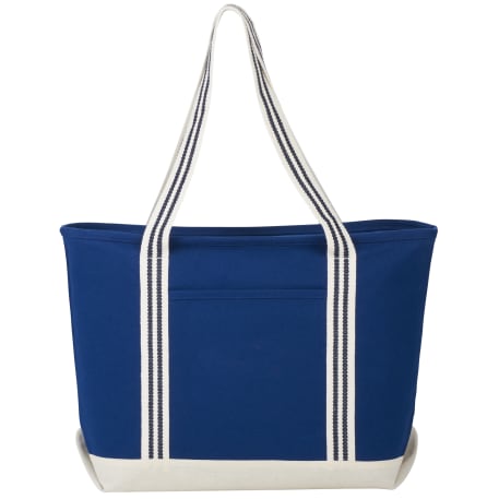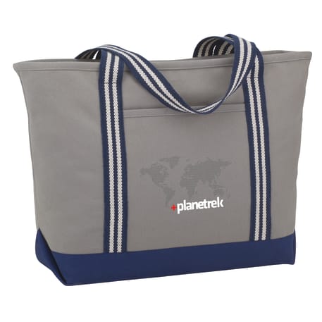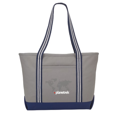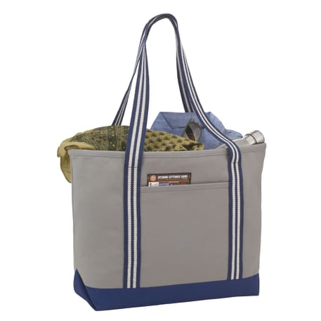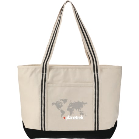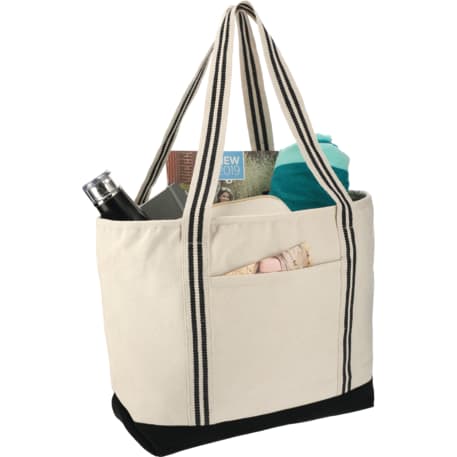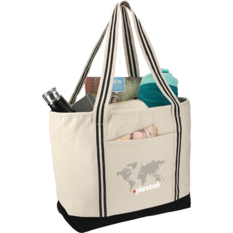 The Stripe Handle 20oz Cotton Canvas Zippered Boat Tote is made from durable all-natural cotton canvas material and features a zippered main compartment and an open front pocket.