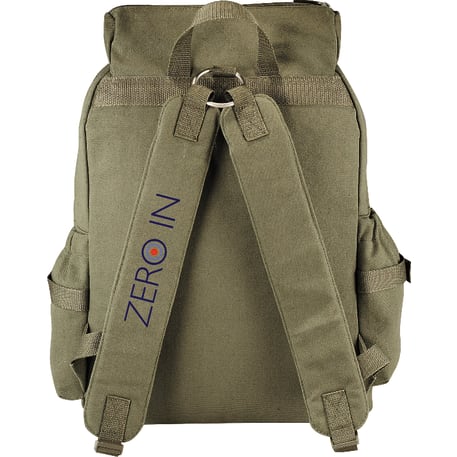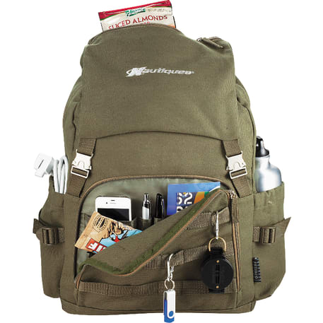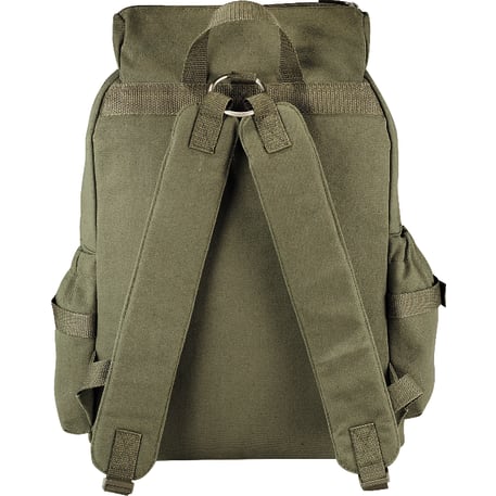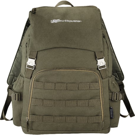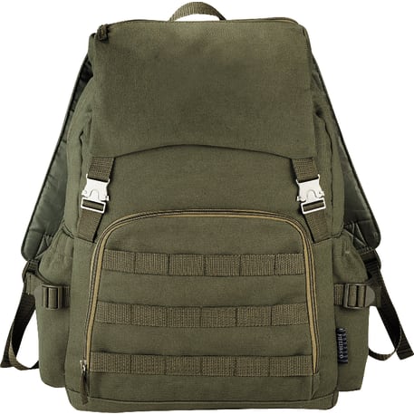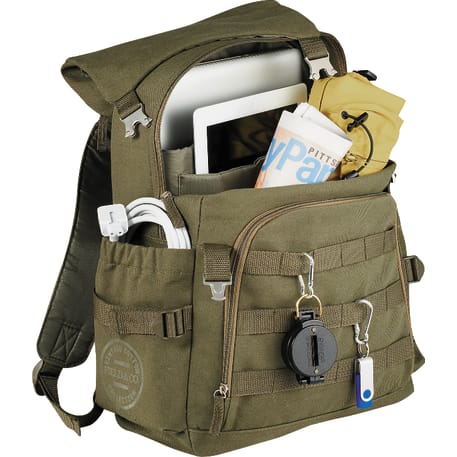 The Field & Co.® Scout 15" Computer Backpack takes its styling from a vintage military look, but the bag is designed to fit the latest tech including up to a 15.6" laptop and tablet, including iPad. Large main compartment and zippered pocket on the top flap let you stash all your extra gear. Elastic fabric pockets on the sides. Zippered front pocket with deluxe organization. Webbing details on the front add additional functionality so you can clip whatever else you need to bring with you. Padded backpack straps attached to metal loop on the back for stability. Unique Field & Co. vintage branding elements and hardware.