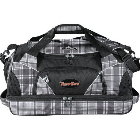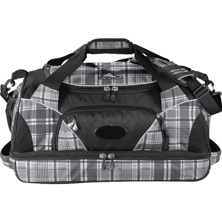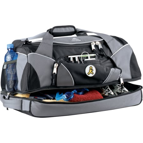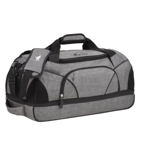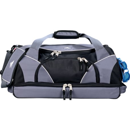 Zippered main compartment with U-shaped opening. Drop-bottom wet compartment with zippered divider panel opens to make one large compartment. Front pocket with deluxe organizer and headphone port. Water bottle and accessory pockets. Includes lifetime warranty.