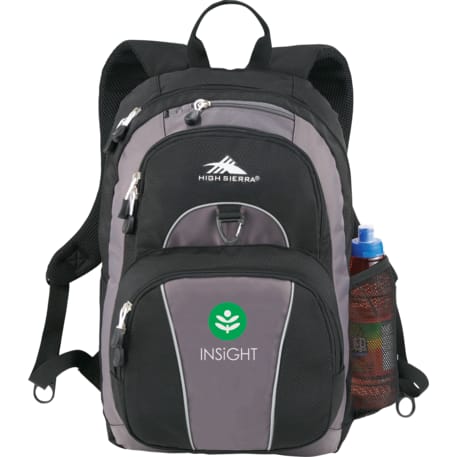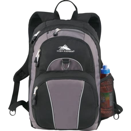 The High Sierra® Enzo Backpack is a multi-compartment backpack that features two large main compartments and an organizer compartment with pen pockets. Top zippered accessory pocket are also offered with a headphone port. Large gusseted side mesh beverage pocket. Comfort is provided by S-shaped padded shoulder straps, a padded back panel and a heavy duty webbing grab handle. Signature High Sierra hardware. Includes lifetime warranty.