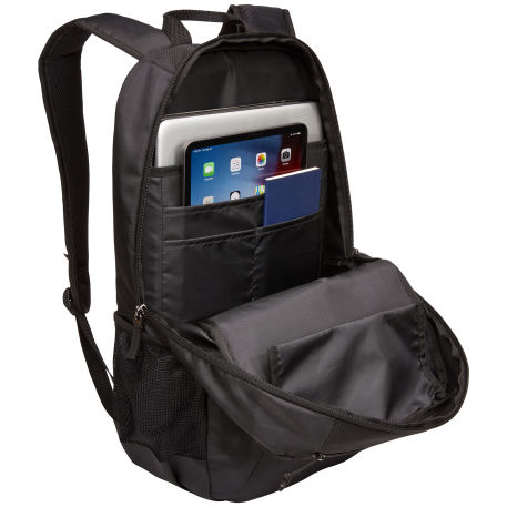 Securely store pens and cords in the zippered internal pocket. The mesh side pocket keeps a water bottle within reach while multiple interior slip pockets provides ample organization for small accessories. Padded back panel with airflow channels provide a comfortable carry. This backpack includes a webbing haul handle and secondary grab handle at the base of bag.