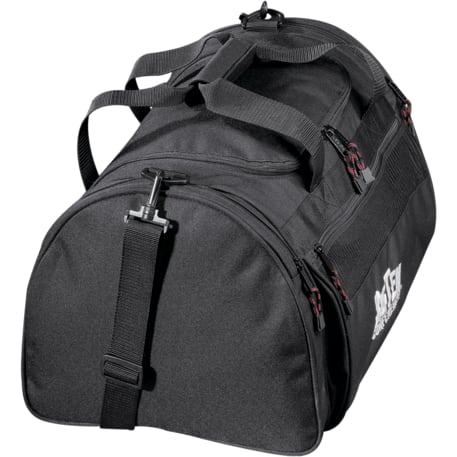 Zippered main compartment. Zippered front and end pockets. Detachable, adjustable shoulder strap.