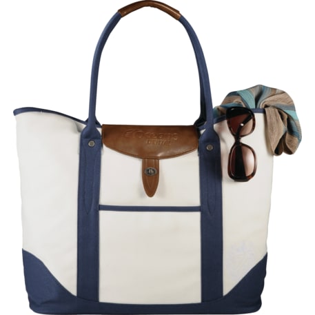 This oversized carry-all tote is great for travel or even the beach. Open main compartment features a leather flap with turnlock closure. 8" handle drop height with leather comfort wrap. Made of rugged 21oz cotton canvas and lined with Cutter & Buck® sleek, striped signature lining. Antique nickel hardware and Cutter & Buck® branding help complete this piece.