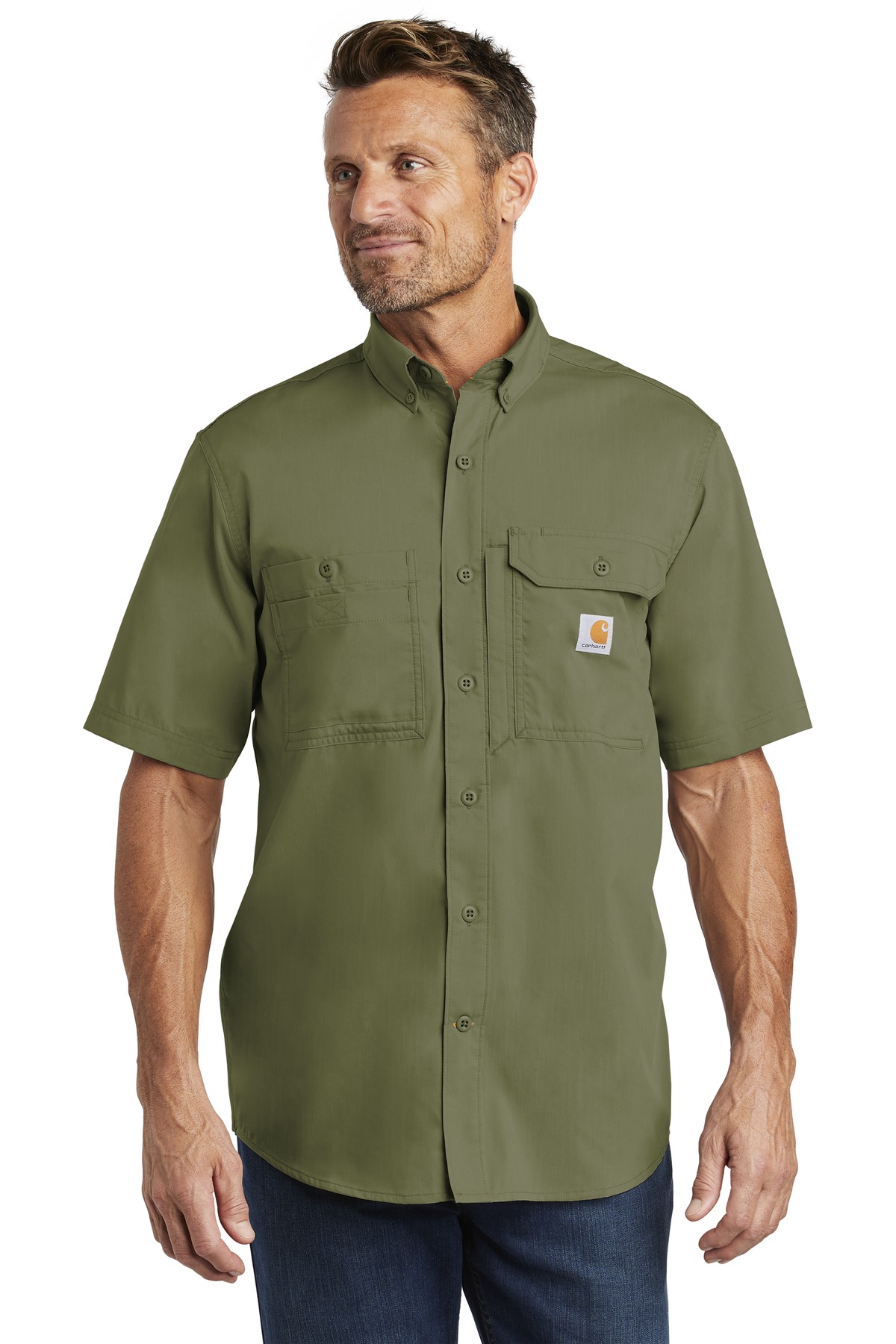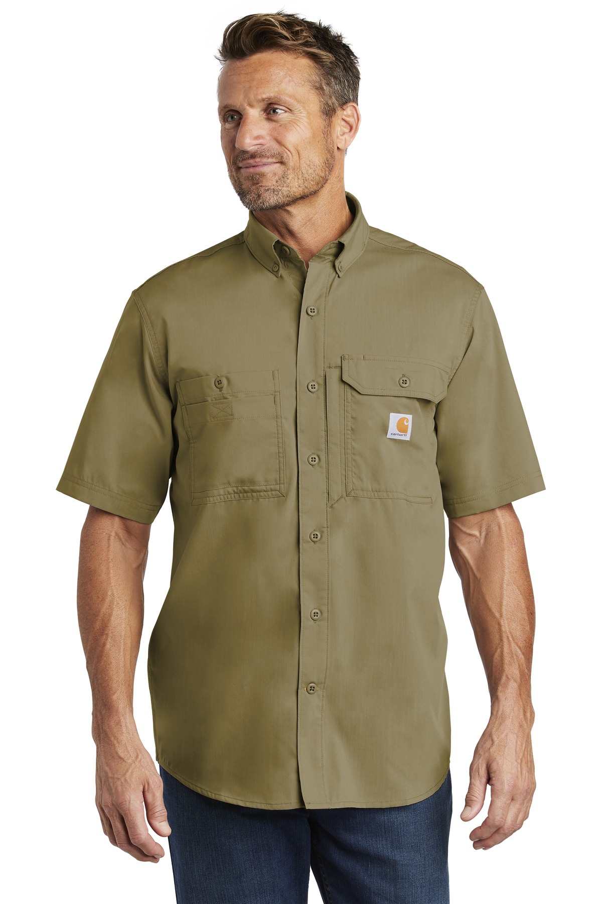 This sweat-busting stain-fighting shirt will also keep you cool as a cucumber. 3-ounce 60/40 poly/cotton sheeting FastDry technology wicks away sweat Stain Breaker technology releases stains Double-layer collar converts to stand-up collar for extra sun protection Mesh-lined vent at center back for flow-through ventilation Four chest pockets: Left has buttoned-flap pocket with an oversized concealed zippered mesh-lined vertical pocket; Right has two easy-entry pockets: one with button closure one with hook and loop closure Contrast color neck piping Carhartt label sewn on left chest pocket Carhartt Force labeling on inner back neck Relaxed fit