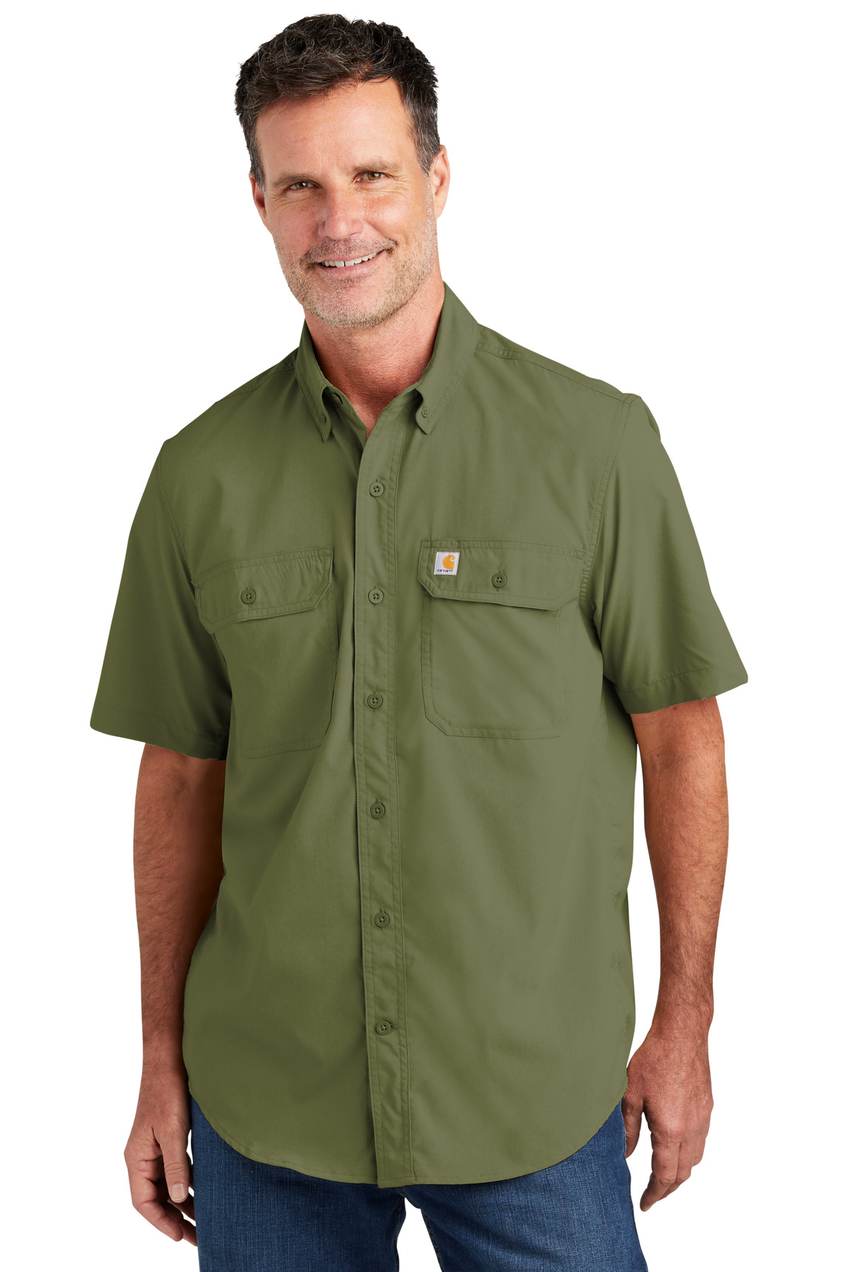 You cant control the weather so you might as well dress for it. With a sun-smart UPF 50+ rating this quick-drying lightweight woven shirt sheds sweat to regulate your body temperature in a range of conditions.2.9-ounce 71/29 poly/nylon chambrayFastDry technology keeps you cool for all-day comfortRugged Flex technology for ease of movementUPF 50+Button-down collar Back yoke shoulder pleats for ease of movementTwo chest pockets with pen stalls mitered flaps and button closuresCarhartt label sewn on left chest pocketRelaxed fit