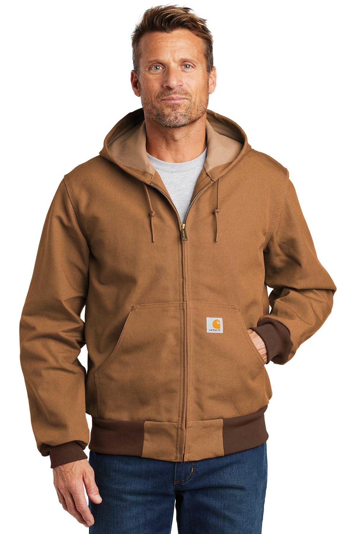 Whether youre on a land survey or construction road crew this wind- and water-repelling hooded jacket is designed to keep you comfortable when the weather is iffy.12-ounce firm hand 100% ring spun cotton duck canvas Water-repellent and wind-resistant Polyester thermal lining Attached thermal-lined three-piece hood with drawcord closure Full-length brass front zipperTwo interior pockets: one zippered one hook and loopTwo large lower-front pocketsRib knit cuffs and waistbandCarhartt-strong triple-stitched main seams Carhartt label sewn on left pocketLoose fit