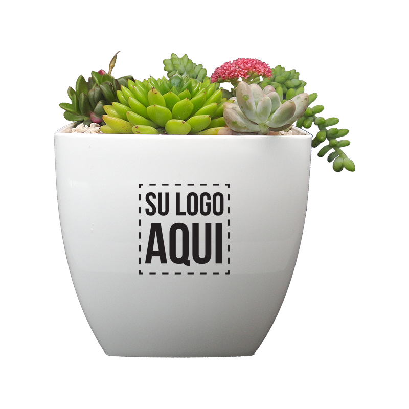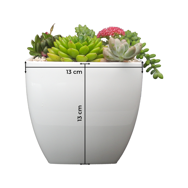 Este terrario mide 13x13 cms y la macetera es cuadrada de color blanco o negro.