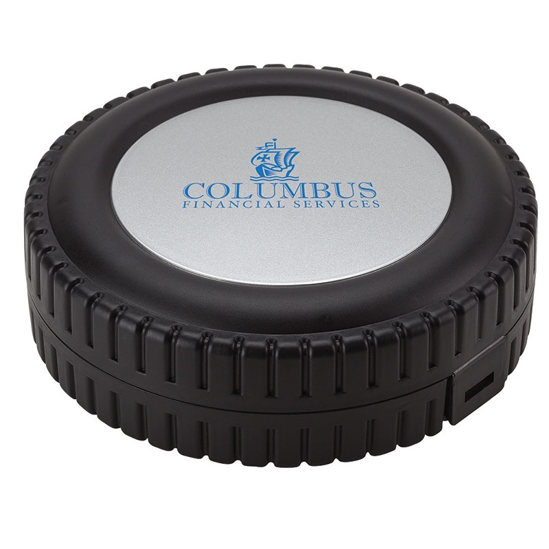 Tire-shaped tool case includes spring-loaded needlenose pliers with cutter, bit driver with 5-piece socket set, 9-piece screwdriver bit and adapter set. Also includes Phillips and flathead mini screwdrivers, 3-piece hex wrench set and a 3 tape measure with inch / metric scale.