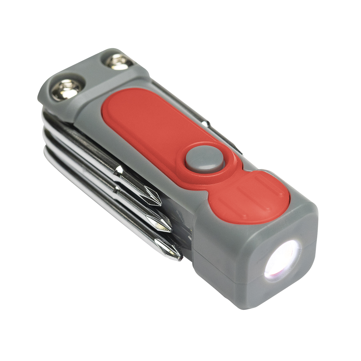 Made Of ABS And Stainless Steel | 3 Flat Head And 3 Phillips Head Bits | Extra Bright White LED Light | Extra Bright White COB Light | Push Flashlight Button Once For Front Light, Push Again For Back Light, Push Again To Power Off | Button Cell Batteries Included