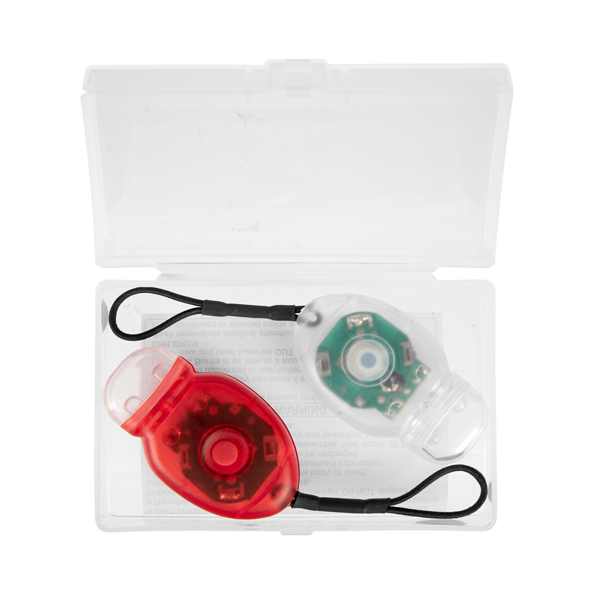 Made Of ABS And PP | Features 2 Lights Stored In A Clear Durable Case With Magnetic Closure | 2 Light Colors – Clear And Red | 30 Lumens | 3 Light Settings – Solid, Slow Flashing And Fast Flashing | Stay Safely Visible While Running, Walking, Biking, Etc. | Elastic Strap To Easily Attach to Bike | Lithium Button Cell Batteries Included