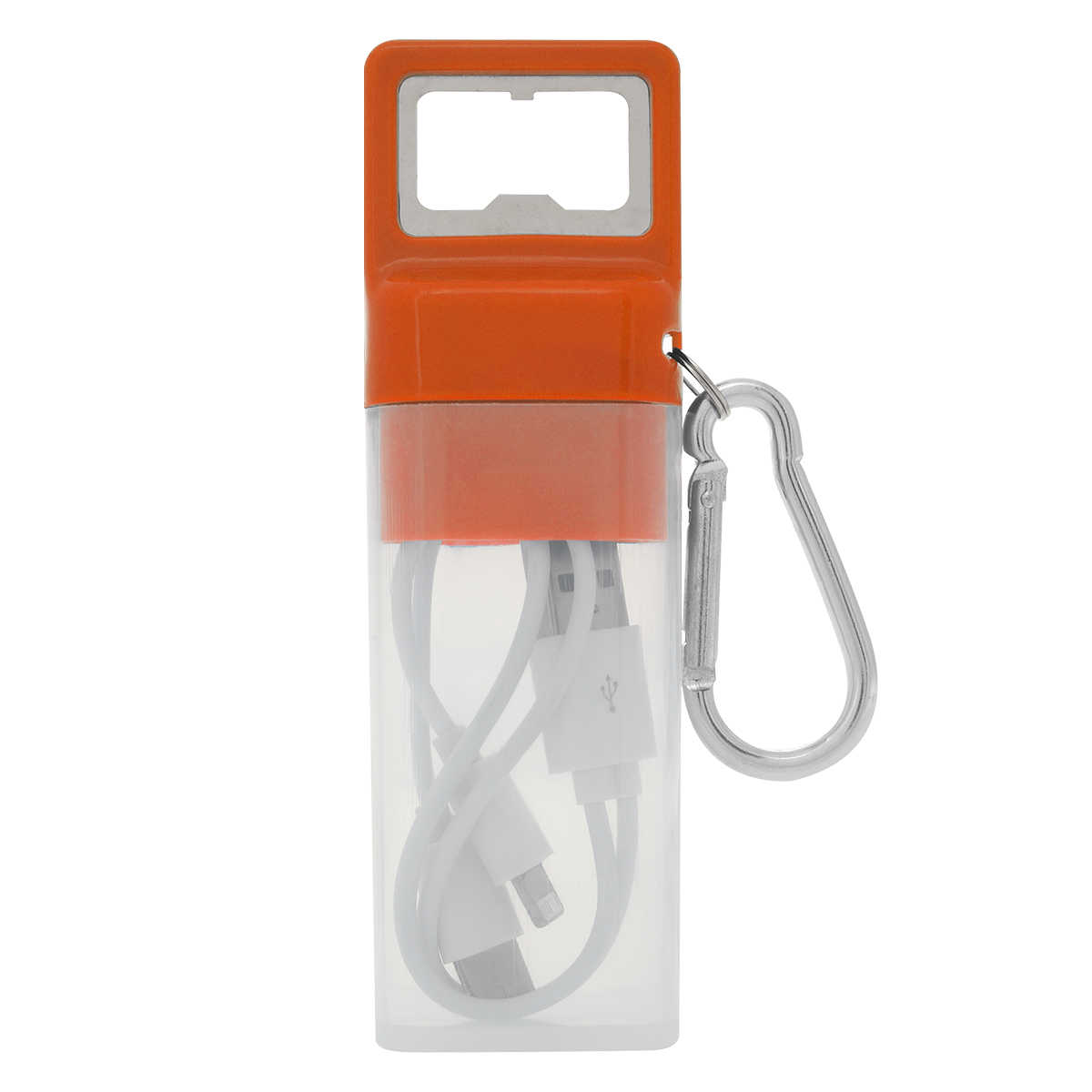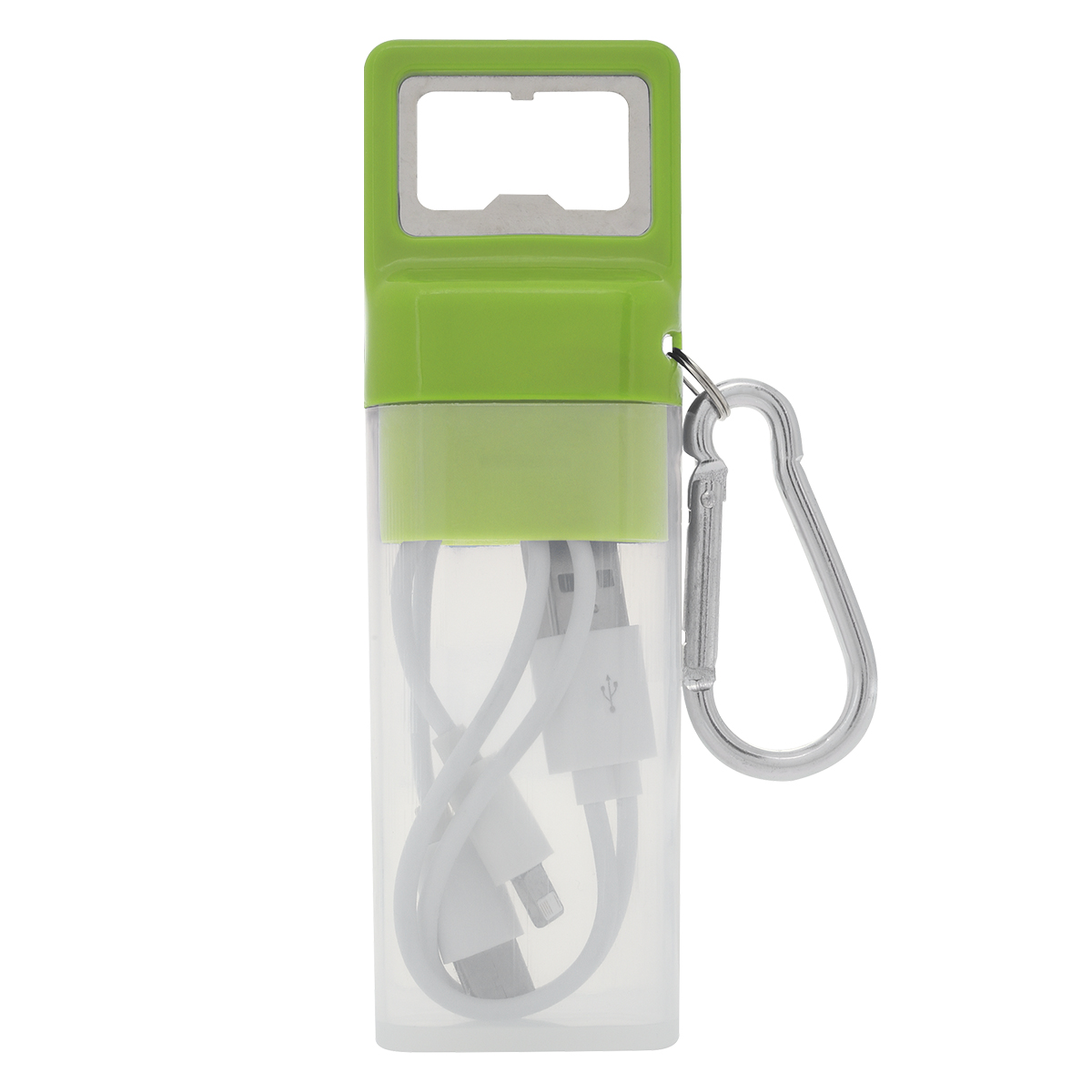 Features Apple® 8-Pin, Micro-USB And Type-C Outputs And USB-A Input | Simply Plug The Cable Into A Powered USB Port And Then Into Your Device | Protective Plastic Travel Case | Bottle Opener On Lid | Carabiner Attachment | Charge Multiple Devices At Once When Using An Ample Power Source | Apple is a trademark of Apple Inc., registered in the U.S. and other countries.