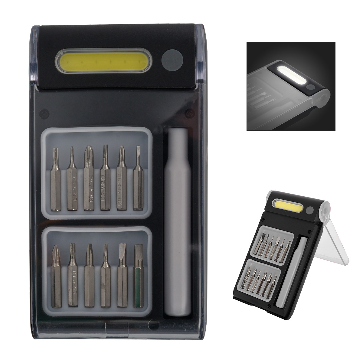 12 Screwdriver Bits | Magnetic Port For Accepting Bits | Extra Bright COB Light | Push Button To Turn On/Off | AAA Batteries Included