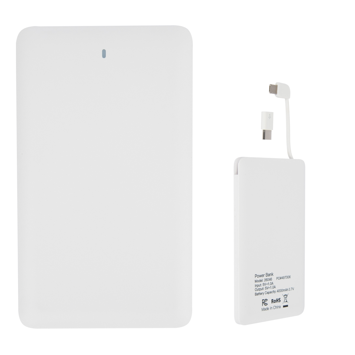 Built-In Apple® 8-Pin & Micro-USB Cord | Includes Type-C Adapter | Type-C Adapter Stores In Top Slot When Not In Use | Indicator Lights | 4000 mAh Lithium Ion Grade A Non-Recycled Battery | Output: 5W | Charges Most Devices | Apple is a trademark of Apple Inc., registered in the U.S. and other countries