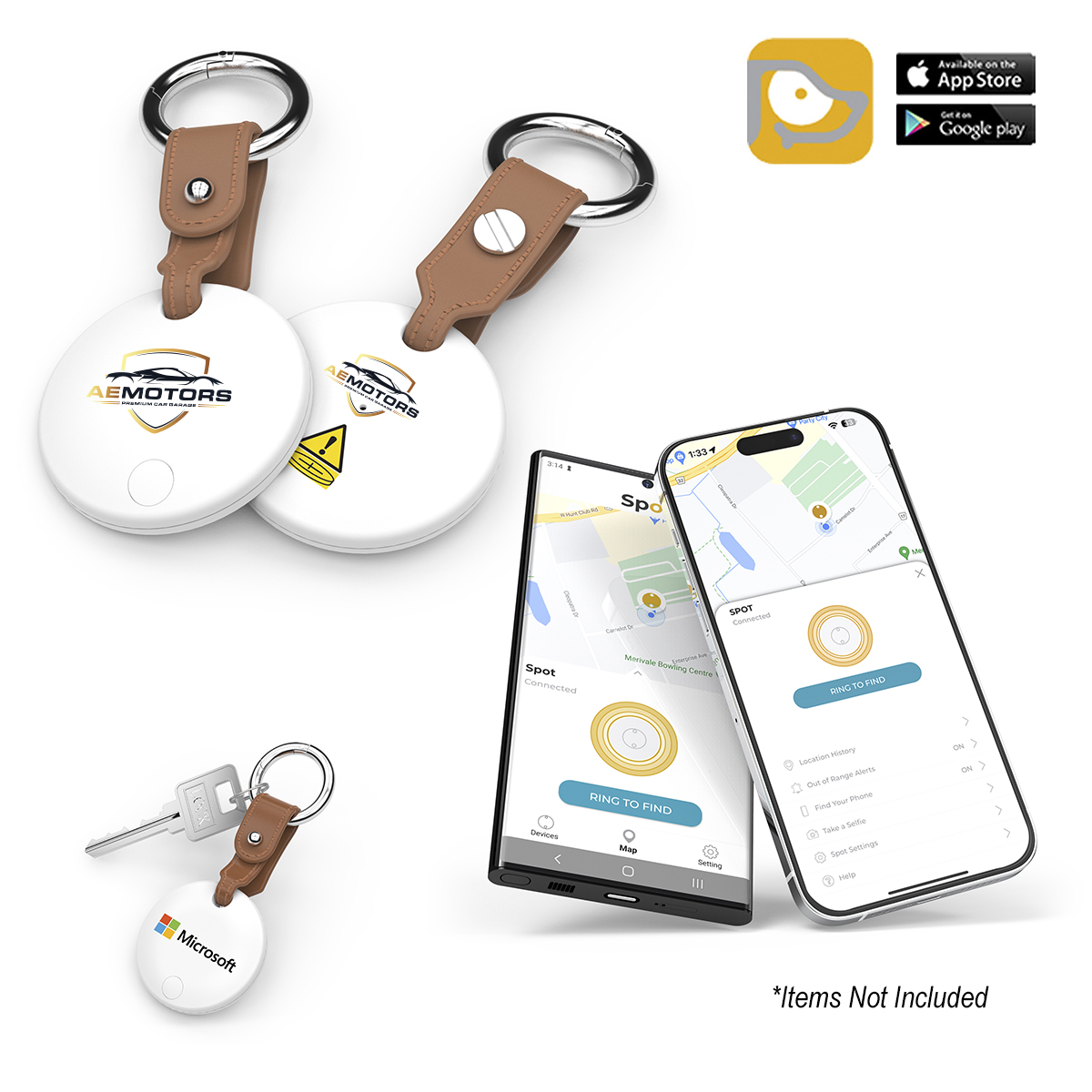 Two-Way Finding Helps Locate Smart Phone Or Spot Pro Device | Features Bluetooth® 5.2 Technology | Attach The Spot Pro Finder To Keys, Purse, Etc. | Includes Faux Leather Strap And Round Metal Carabiner | Connects Up To 200 Ft From Your Phone Or Tablet | Location History Will Map The Last Location Your Spot Was Together With Your Phone | Out Of Range Alerts Will Sound An Alert From Your Phone When Spot Gets Too Far | Connect And Manage Up To Four Spot Pro Devices | Replaceable Battery | Free App For IOS and Android Devices | The Bluetooth® word mark and logos are registered trademarks owned by the Bluetooth SIG, Inc. and any use of such marks by Hit Promotional Products, Inc. is under license. Other trademarks and trade names are those of their respective owners. | Apple® is a trademark of Apple Inc., registered in the U.S. and other countries. iOS is a trademark or registered trademark of Cisco in the U.S. and other countries and is used under license.