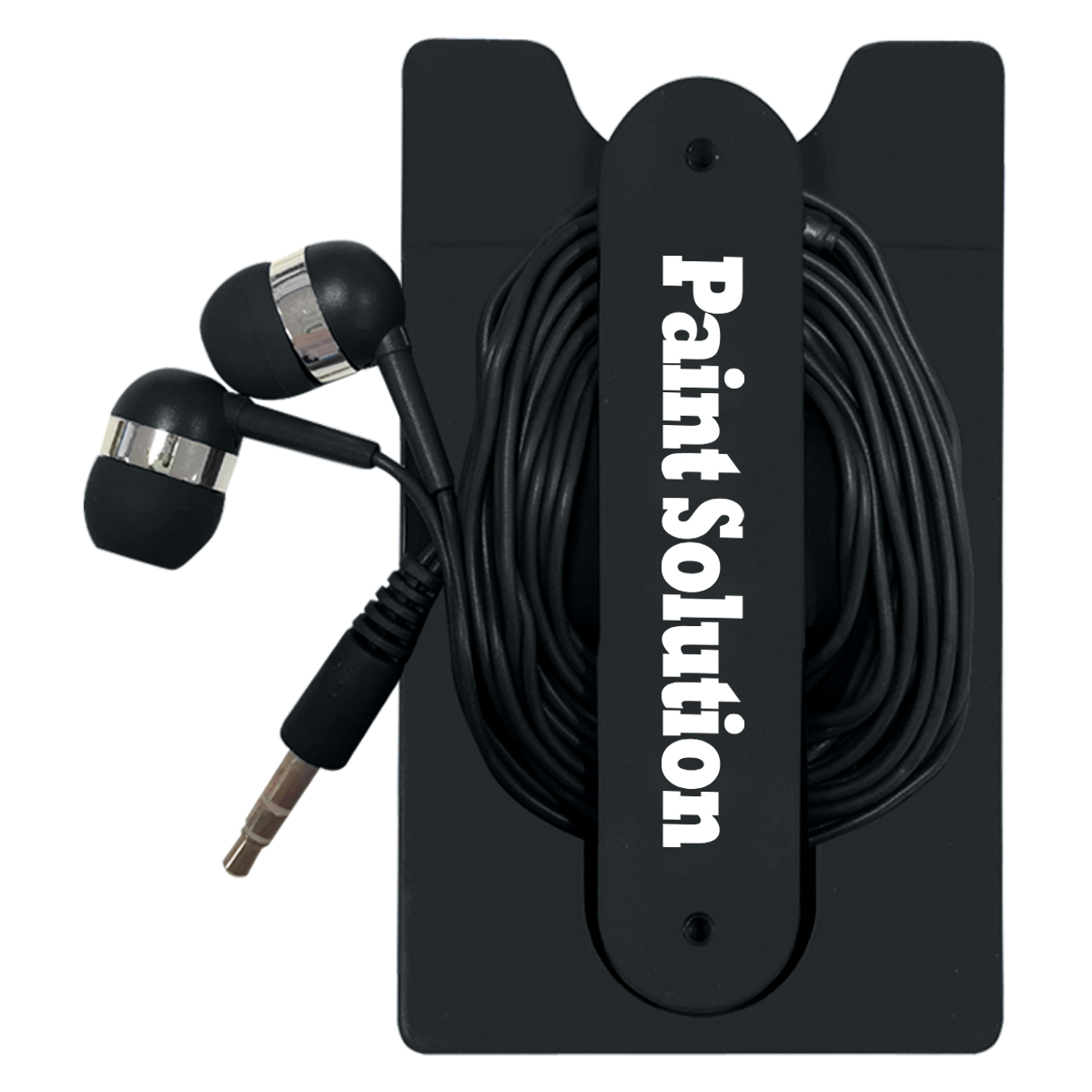 Adheres To Back Of Your Phone With Strong Adhesive | Perfect For Carrying Identification, Room Keys, Business Cards, Cash Or Credit Cards | Doubles As A Vertical Or Horizontal Phone Stand | Simply Push Down On The Center Strip Of The Wallet To Prop Up Your Phone! | Matching Earbuds With 48" Cord | Wrap Earbuds Around To Stay Tangle Free | Works With Most Audio Devices