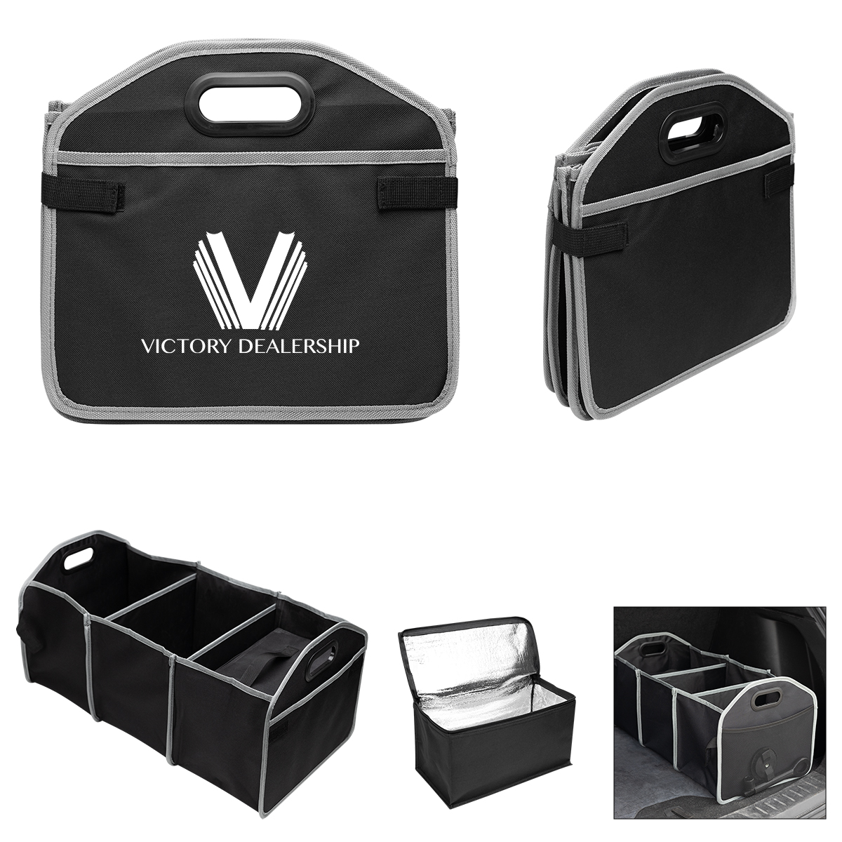 Made Of 600D Polyester With 210D Lining | Cardboard And PE Foam Sides And Cardboard Bottom Gussets Help Keep Organizer Sturdy | Includes Foil Laminated PE Foam Insulated Cooler Bag | 3 Compartments | Structured Sides And Bottom Gusset | Side Carrying Handles | Side Slip Pocket | Side Mesh Pocket | Folds Flat And Stays Closed With Hook Loop Closure For Convenient Travel & Storage | Use As A Trunk Organizer, Shopper Tote Or For Storage | Spot Clean/Air Dry