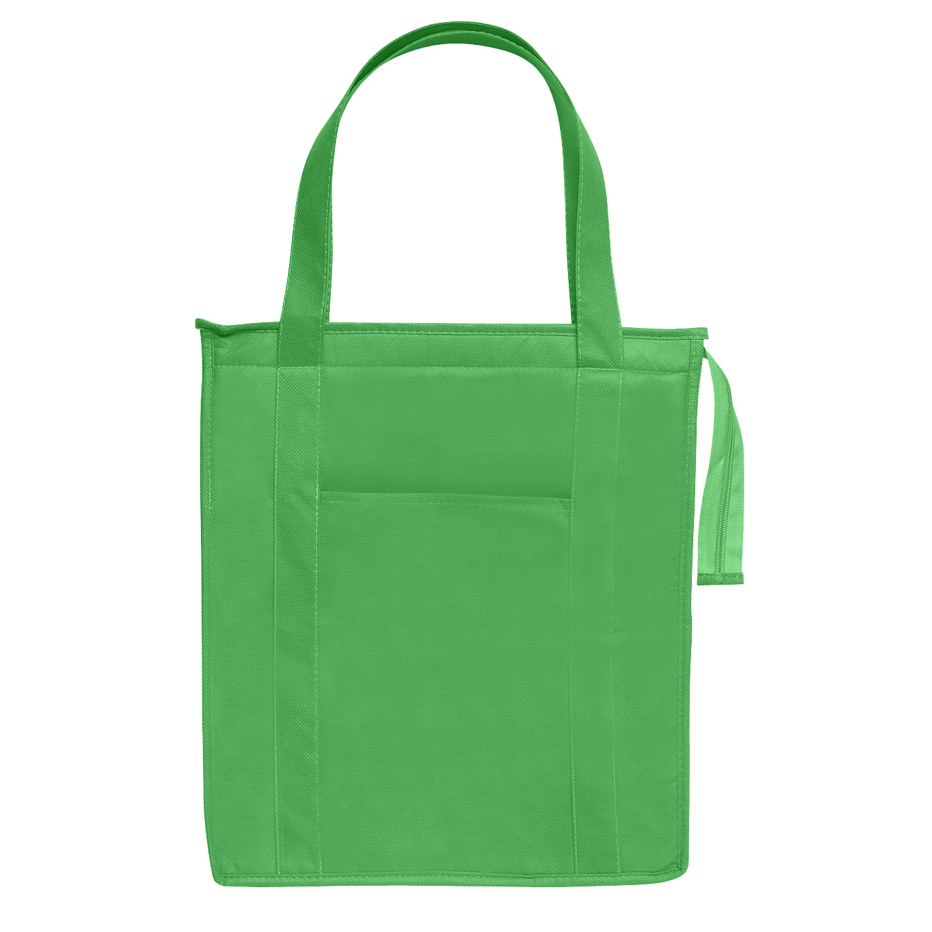 Made Of 80 Gram Non-Woven, Coated Water-Resistant Polypropylene | Foil Laminated PE Foam Insulation | Great For Grocery Stores, Markets, Etc. | Top Zippered Closure | Front Pocket | Keeps Food Hot Or Cold | 9" Gusset | Reusable | 23" Handles | Spot Clean/Air Dry