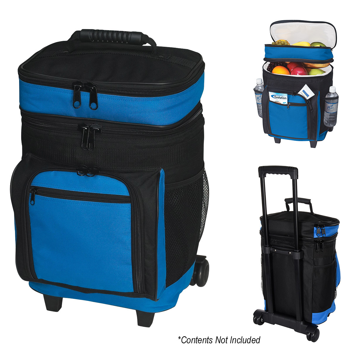 Made Of 600D Polyester | White PEVA Lining | Web Carrying Handle With Comfortable Plastic Grip | 2 Side Mesh Pockets | 2 Front Zippered Pockets | 2 Separate Insulated Compartments | Double Zippered Upper And Lower Compartments | Retractable Handle Rolling Cooler With Wheels | Holds Up To 30 Cans | Spot Clean/Air Dry