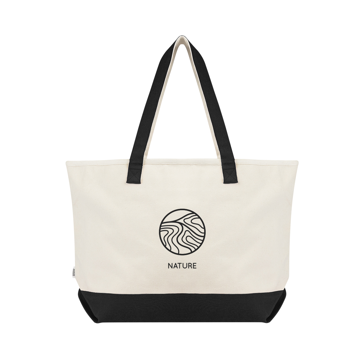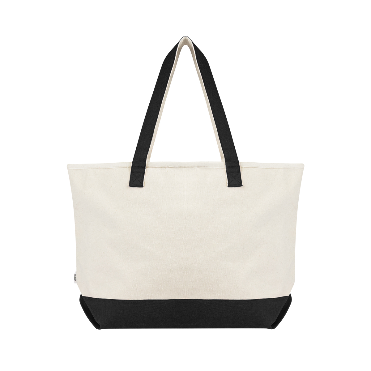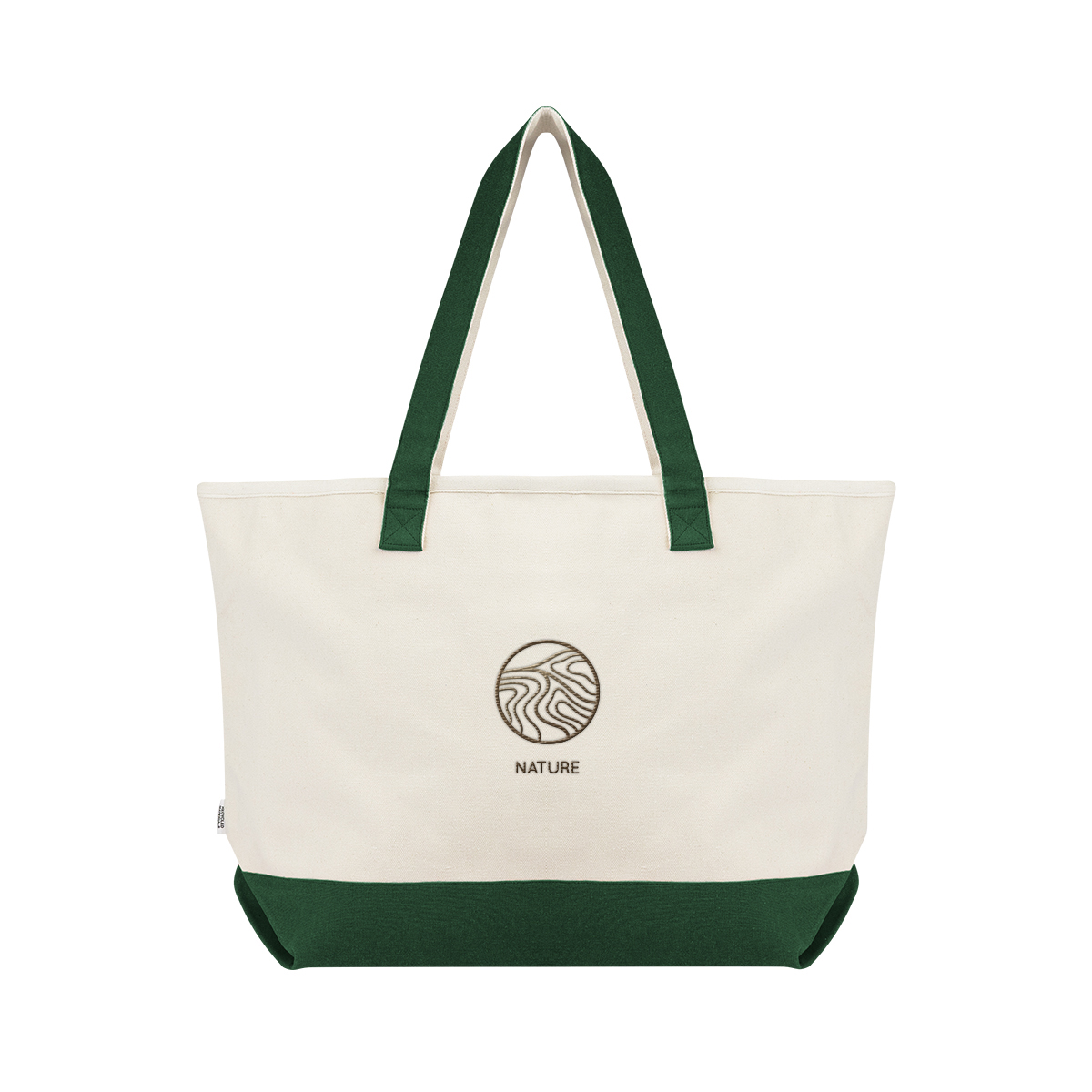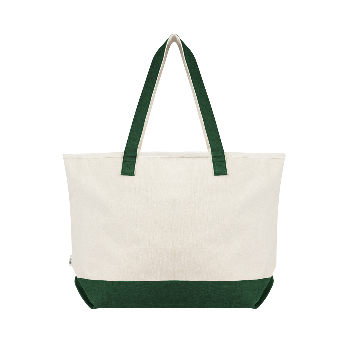 Made Of 19 Oz. Recycled Cotton Canvas | 600 GSM Recycled Canvas And 140 GSM Recycled Cotton | Zippered Main Compartment | 28" Handles | 4" Bottom Gusset | Spot Clean/Air Dry