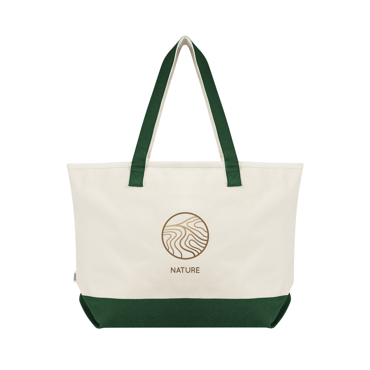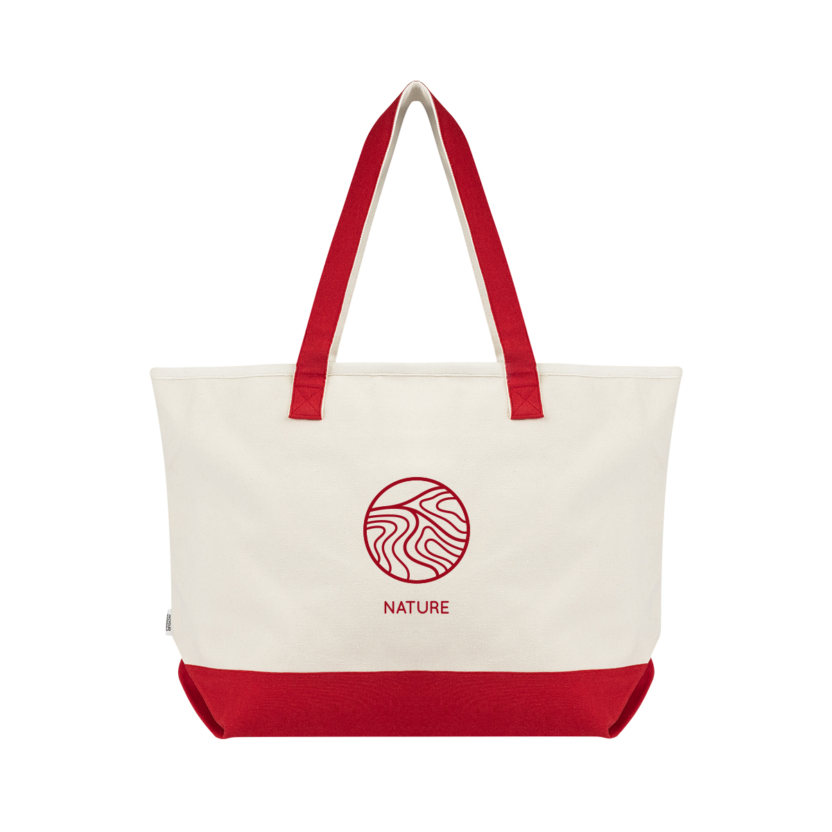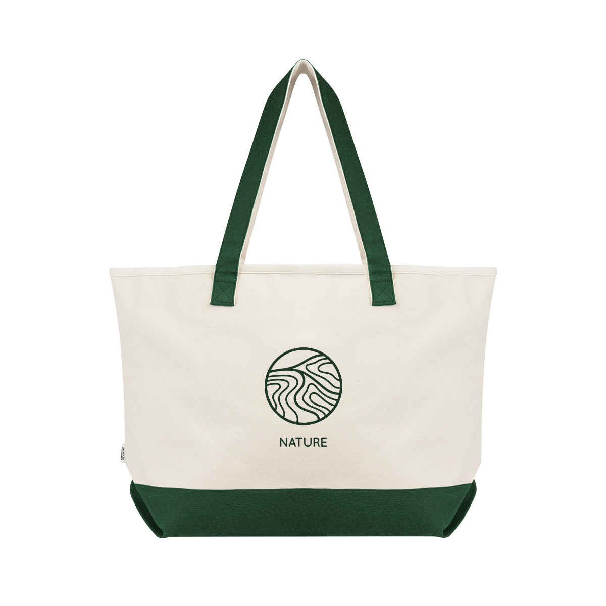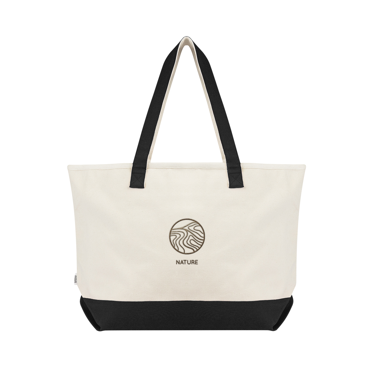 Made Of 19 Oz. Recycled Cotton Canvas | 600 GSM Recycled Canvas And 140 GSM Recycled Cotton | Zippered Main Compartment | 28" Handles | 4" Bottom Gusset | Spot Clean/Air Dry