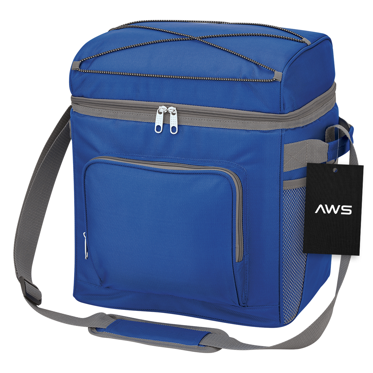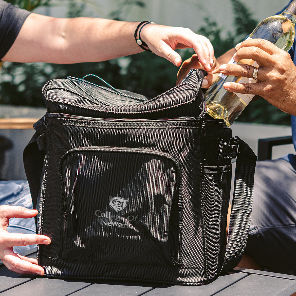 Made Of 680D Polyester | PEVA Lining | Double Zippered Main Compartment | Adjustable Padded Shoulder Strap And Web Carrying Handles | Two Side Pockets With Mesh Accents | Front Zippered Pocket | Inside Mesh Zippered Pocket | Bungee Cord Storage On Top | Holds Up To 24 Cans | Spot Clean/Air Dry