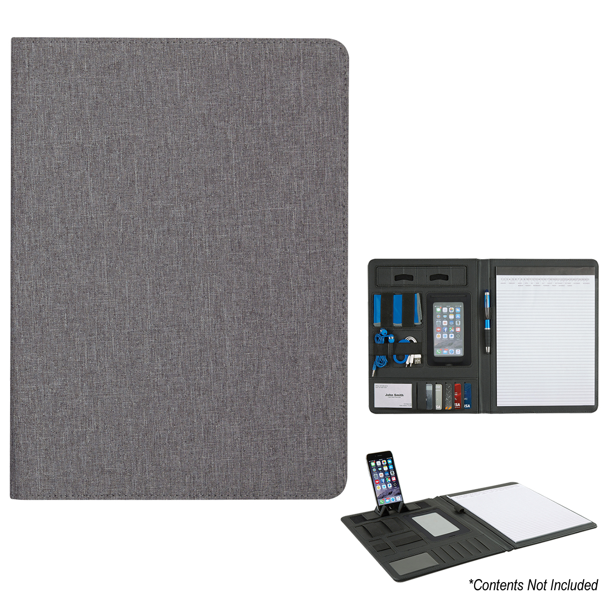 Includes 30 Page 8 ½" x 11" Lined Writing Pad | Slots And Pockets For Multi-Media Organization | Phone Or Tablet Stand | Holds A Variety Of Phone Sizes For Easy Viewing | Card Holders, Elastic Pen Loop And ID Holder | Made Of Polyester