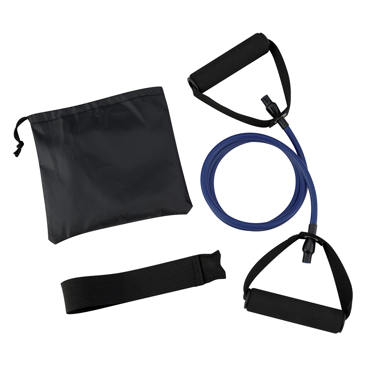 Stretchable Latex Material | Foam Comfort Grip Handles | One 8 ¼" Door Anchor | Band Size: 64" Long | Nylon Pouch With Drawstring Closure | Great For Travel
