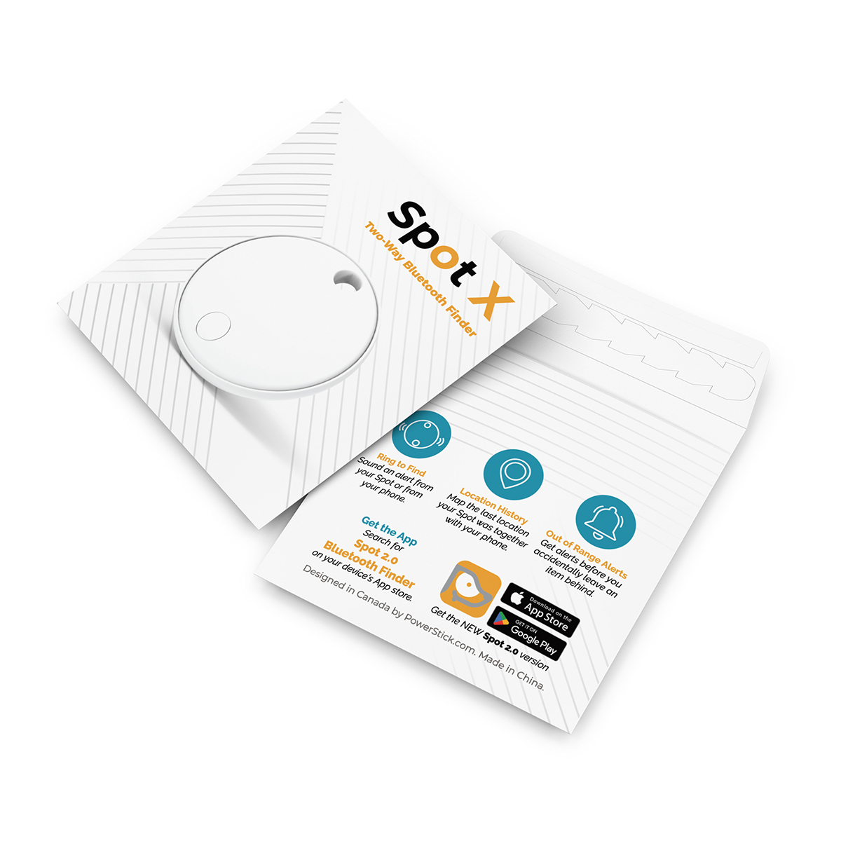Wireless Two-Way Finder Featuring Bluetooth® 5.2 Technology | Attach The SpotX To Keys, Purse, Etc. | The Network Of Spot Users Can Help Find It, Two-Way Finding Helps Locate Your Spot And/Or Phone, Range Of 200 Ft. | Location History Will Map The Last Location SpotX Was Together With Your Phone | Out of Range Alerts Will Sound An Alert From Your Phone When SpotX Gets Too Far | Proximity Meter Is An Indicator Of The Connected Signal Strength Shown By Yellow Rings, Mark As Lost If A Spot Is Lost & Shows Disconnected | Compatibility: iOS 8.0 or Later & Android 4.3 OS or Later | Ring To Find Sounds An Alert From SpotX | Features A Replaceable Cell Battery | Free App For iOS And Android Devices | The Bluetooth® word mark and logos are registered trademarks owned by the Bluetooth SIG, Inc. and any use of such marks by Hit Promotional Products, Inc. is under license. Other trademarks and trade names are those of their respective owners.