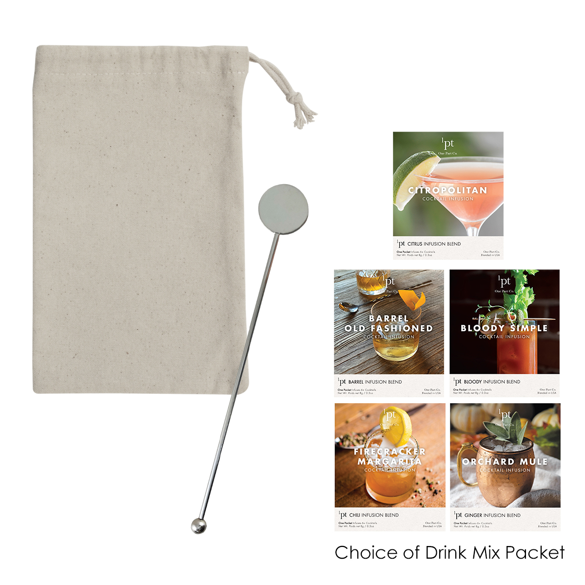 Set Includes One #50016 Stainless Steel Cocktail Stirrer, #6238 Cotton Carrying Pouch And Choice Of One Cocktail Infusion Drink Packet | Pricing Includes 1-Color/1-Location Imprint On Stainless Steel Cocktail Stirrer and Pouch. Cocktail Packets Sold Blank.