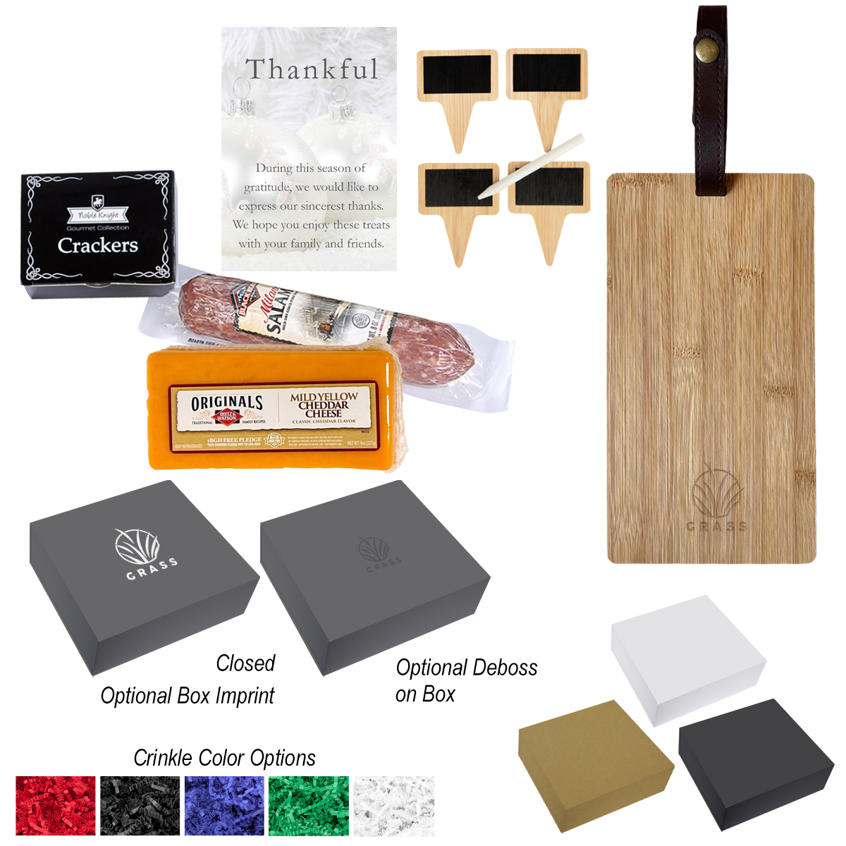 Kit Includes #75034 Cheese Markers, #76137 Bamboo Cutting Board, Dry Cured Salami, Cheese And Crackers. | Pricing Includes 1-Color/1-Location Imprint On #76137 Bamboo Cutting Board. Cheese Markers, Dry Cured Salami and Cheese Included As Shown. Includes choice of stock design or use your own custom art on included card. | Create Your Own Message With The Included Insert Card. Add Your Own Design or Choose From Any Stock Design. Optional Stock Design Shown.