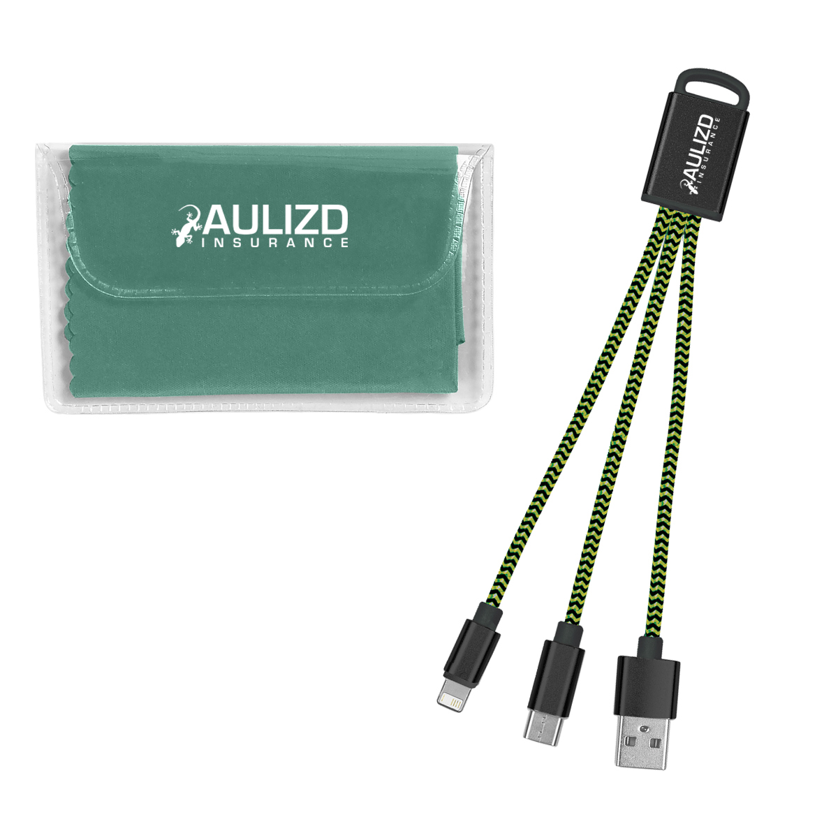 Set Includes #2829 - 3-In-1 Braided Charging Buddy And #6242 Microfiber Cleaning Cloth In Case | Pricing Includes 1-Color Imprint In 1-Location Each Item