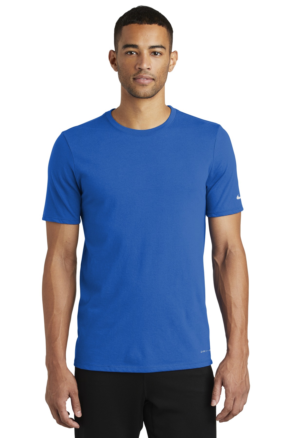 This Nike performance tee features sweat-wicking fabric to help keep you dry and comfortable. Durable rib knit crew neck. Heat transfer label for tag-free comfort. Double-needle stitching throughout. Contrast heat transfer Swoosh design trademark on left sleeve. Made of 4.7-ounce 60/40 cotton/poly Dri-FIT fabric.