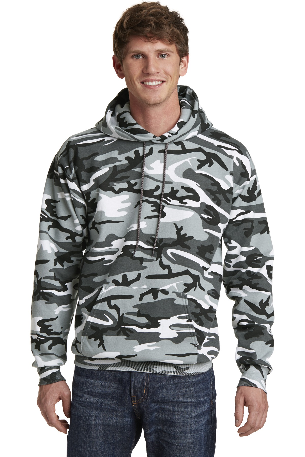 Our cozy pullover hooded sweatshirt in a classic camo print.7.8-ounce 50/50 cotton/poly fleeceAir jet yarn to reduce pillingFront pouch pocketThe camo print is pigment-dyed. Special consideration must also be taken when printing white ink on pigment-dyed cotton.