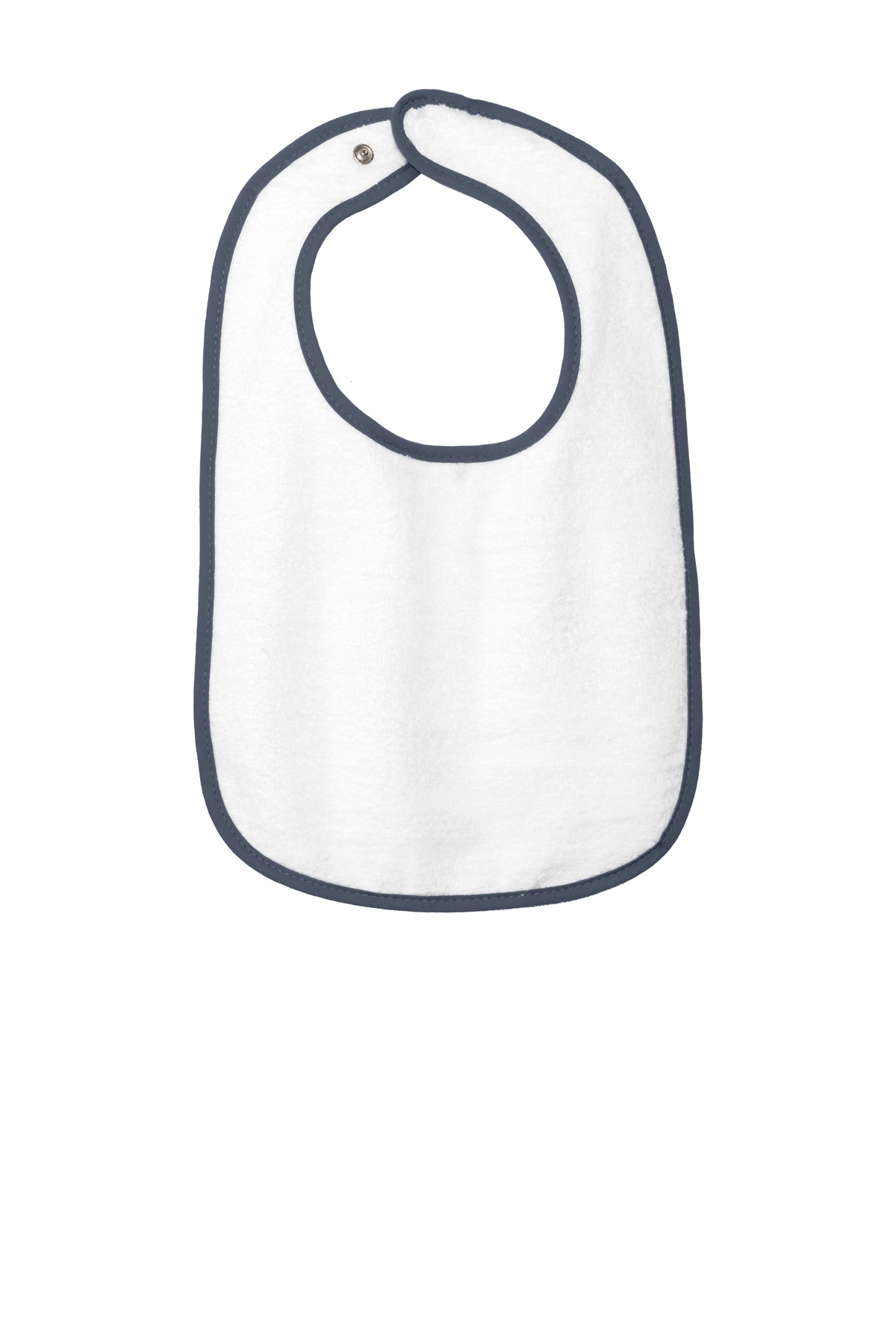 Perfect for mess-free meals. This bib is made of heavyweight absorbent terry cloth to help keep baby clean while eating. 100% cotton terry Contrast color binding Velcro brand hook and loop closure EasyTear label for additional comfort and ability to brand as your own