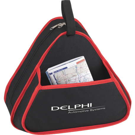 The Emergency Auto Kit features a zippered reflective carry case with open storage pocket contains 100-amp jumper cables, flathead screwdriver, Phillips-head screwdriver, rubber electrical tape, rubber friction cotton gloves and a tire gauge. It also has a reinforced top carry handle.