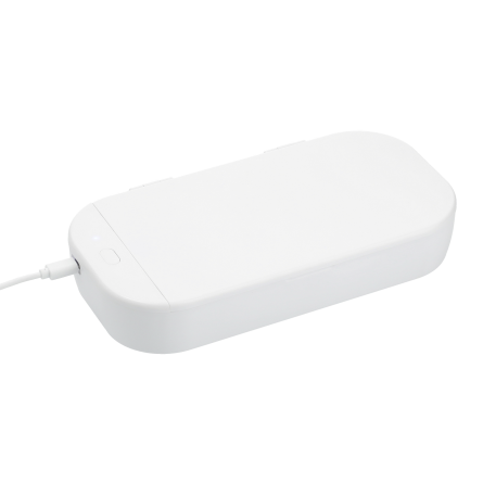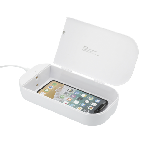 This UV Desktop Phone Sanitizer uses UV-C light technology for sanitization to kill 99% of microorganisms tested. The desktop sanitizer contains two UV germicidal LEDS for optimal sanitation. Press the button once for a 10-minute-deep clean sanitization. It can sanitize almost anything that fits inside (6.96" L * 3.7" W * 1.39" H) such as large phones (iPhone 12 Pro Max), keys, credit cards, watches, eyeglasses, jewelry, etc.. The sanitization will be stopped automatically once the lid is lifted to avoid UV light exposure. Includes a 19.6" Micro USB cable. The item does not contain a battery. Available for shipment within the United States (including Alaska Hawaii & Puerto Rico). Not available for export.