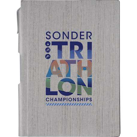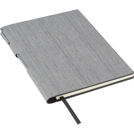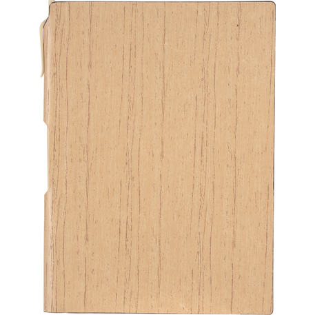 The 6" x 8.5" Bari Notebook is an A5 bound notebook designed to look like wood. It includes 80 sheets of beige ruled paper and a matching plastic ballpoint pen in the spine. Hard cover.