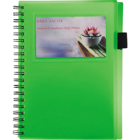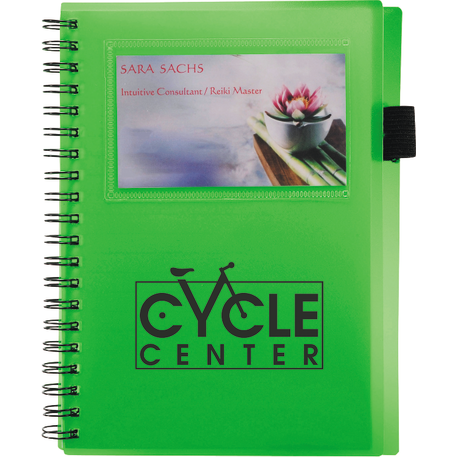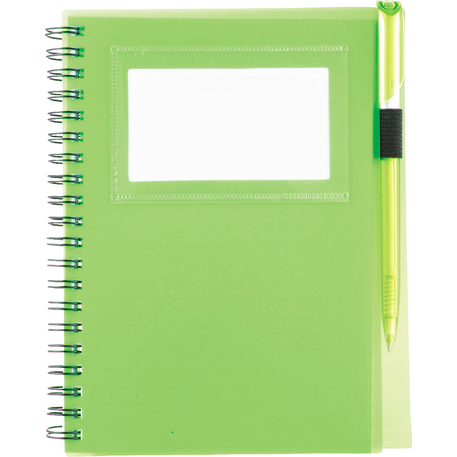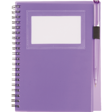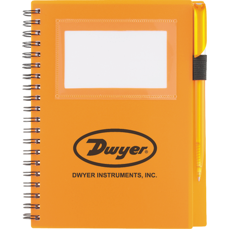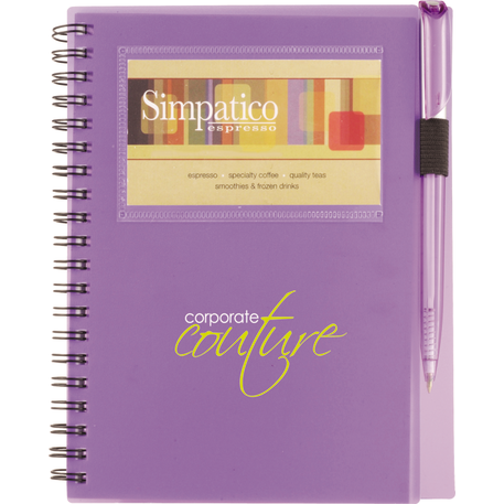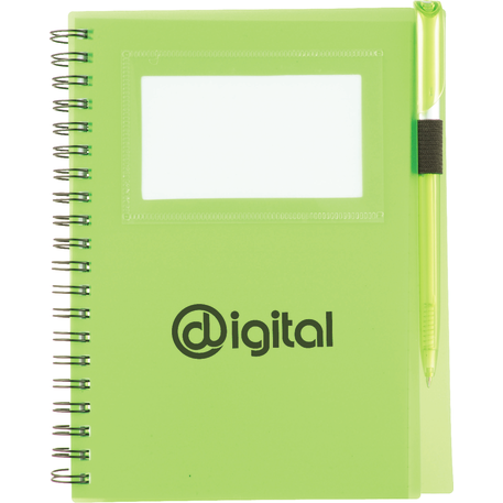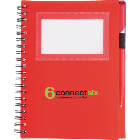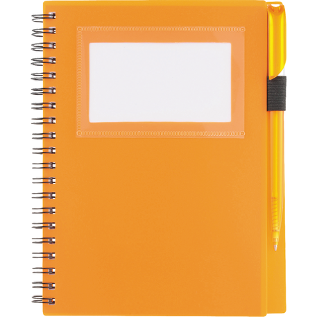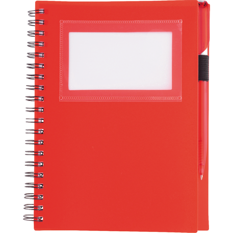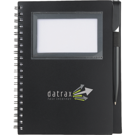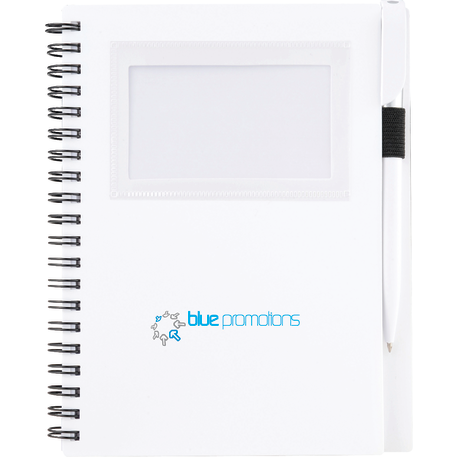 The 5.5" x 7" Star Spiral Notebook has a clear window ID/card slot on the front cover with a matching ballpoint pen. It includes a twist-action ballpoint pen with elastic pen loop, as well as 70 white ruled pages. Hard, flexible cover. The window area can hold cards or photos that can be 2” x 3.5”. A pen imprint is not available and all pens are packed separately.